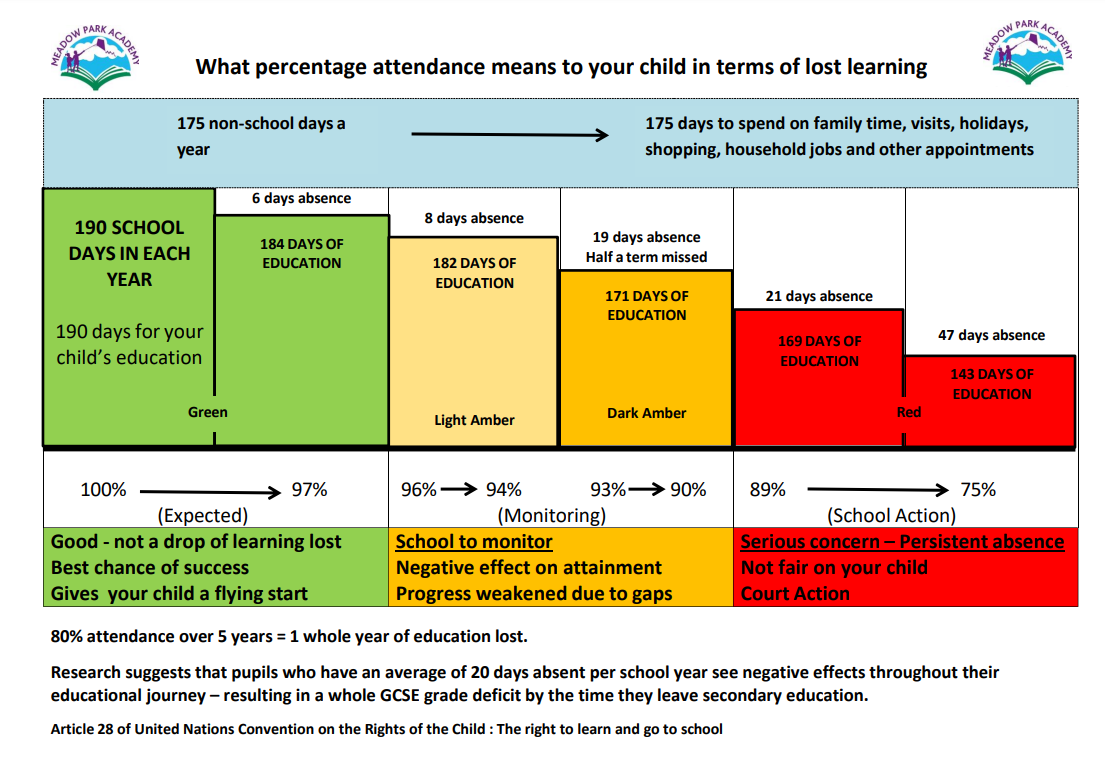 All of the above measures are designed to ensure our children at Meadow Park Academy miss as little school as possible. Every child matters and every child’s education is vital to their lifelong learning. Good attendance plays a crucial part in enabling every child to succeed and thus achieve their full potential.
