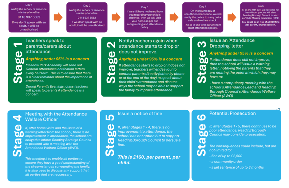 Good attendance is crucial to every child’s progress in their education. Here at Meadow Park Academy, attendance is monitored very closely in partnership with the Education Welfare Department within Reading Borough Council.
