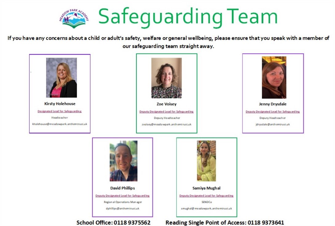 Please contact any of these individuals if you have concerns about a child who attends Meadow Park Academy, or if you have any questions surrounding Safeguarding or Child Protection.